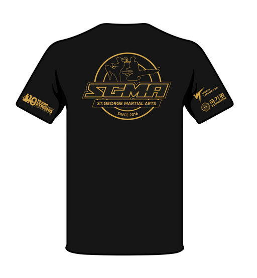 The SGMA Black Belt Elite Training Tee (2026) 10 Years Strong Anniversary is available to all enrolled BBE members and can be worn to both Kingsgro...